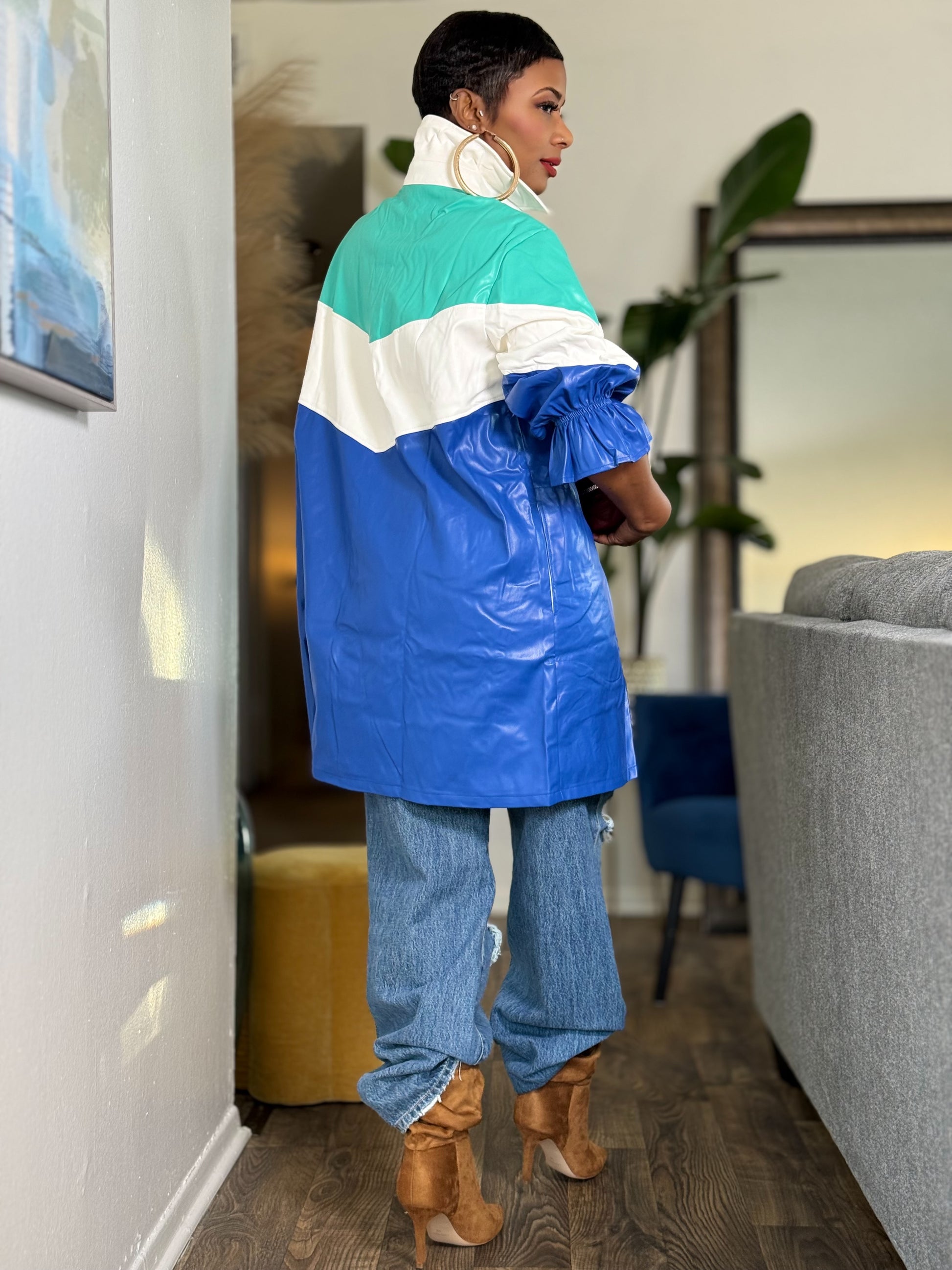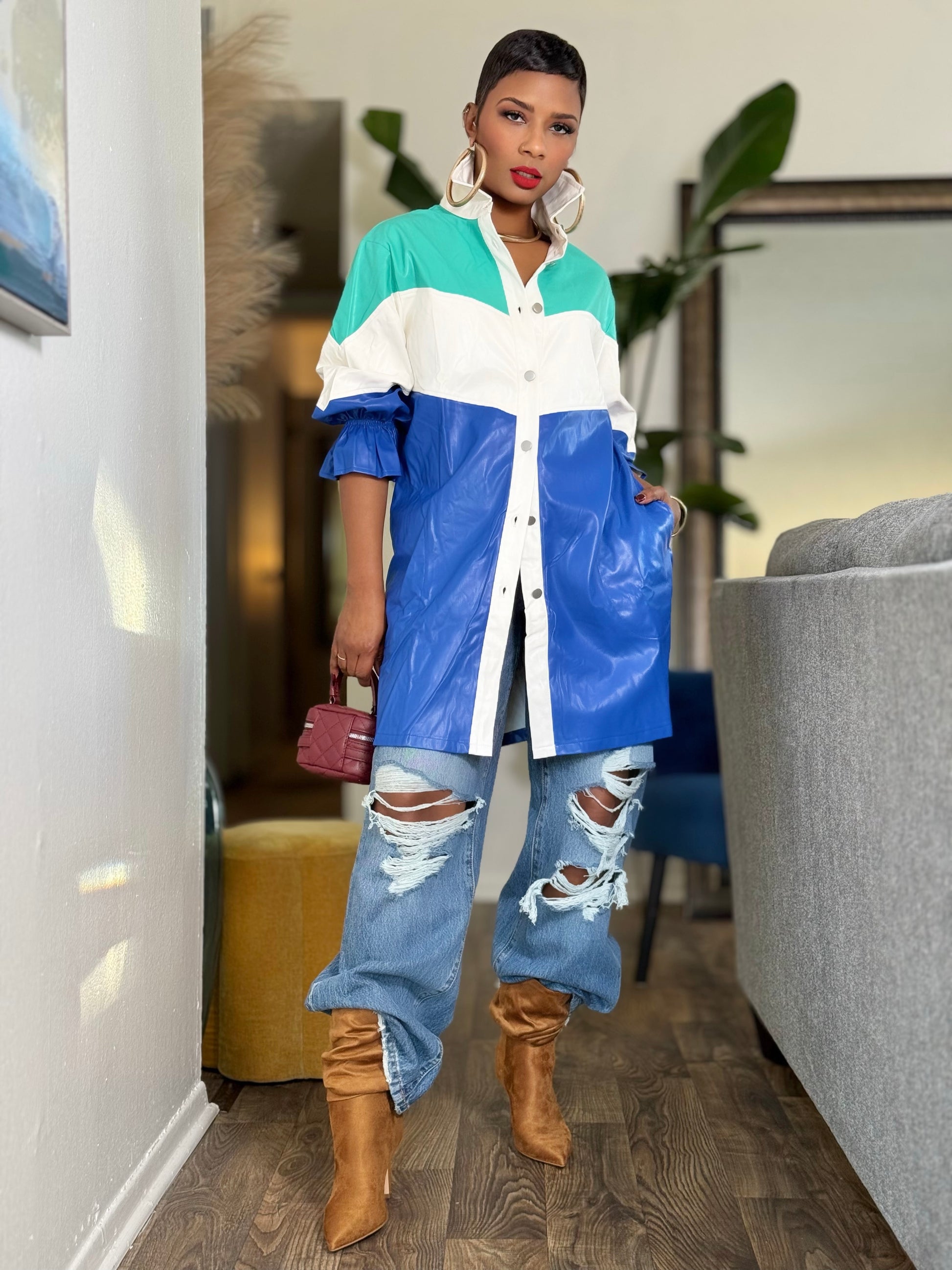 A premium faux leather, color blocked finish elevates this feminine yet edgy dress featuring a collared neckline, 3/4 sleeves with elasticized detailing, button front and pockets; pictured worn as a shirt.