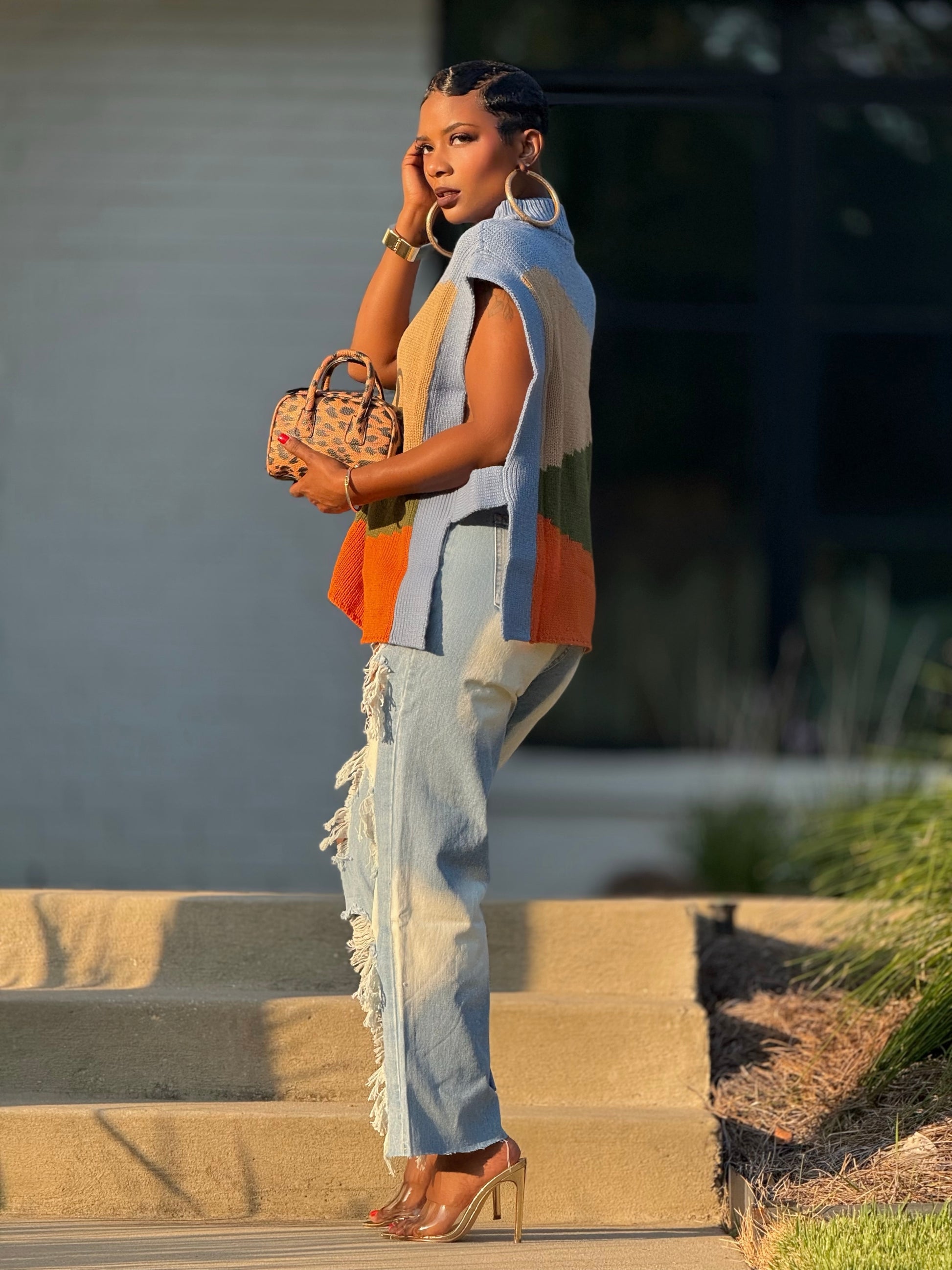 Showcase a trendy, artsy look with this color block sweater vest featured in a sleeveless style with turtleneck ribbed neckline and side cut out detailing.