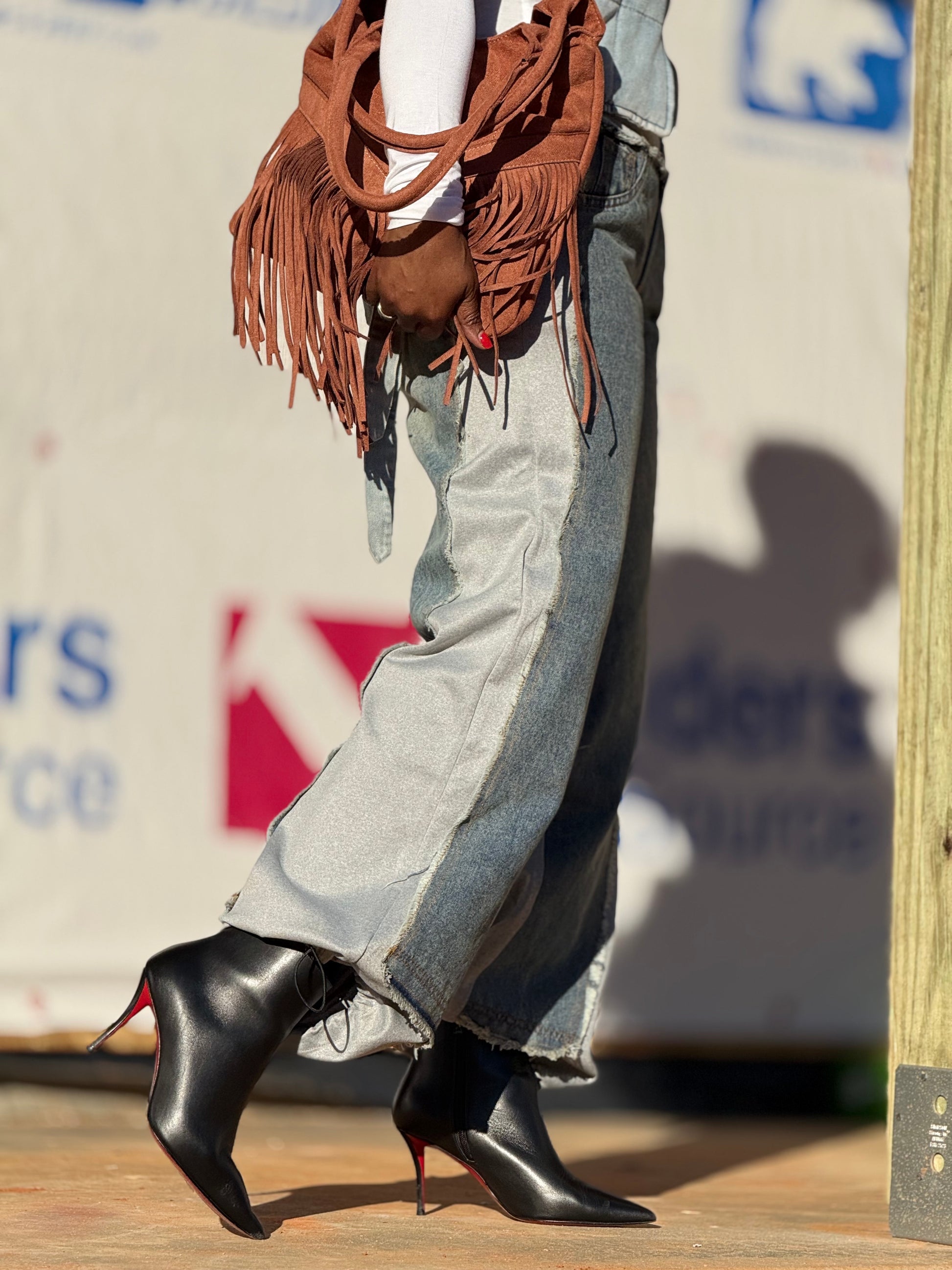 Add a sporty chic vibe to your denim collection with these high-waisted, denim contrast jeans featuring grey inset detailing, raw trim, button/zip closure, pockets and adjustable drawstring hem.