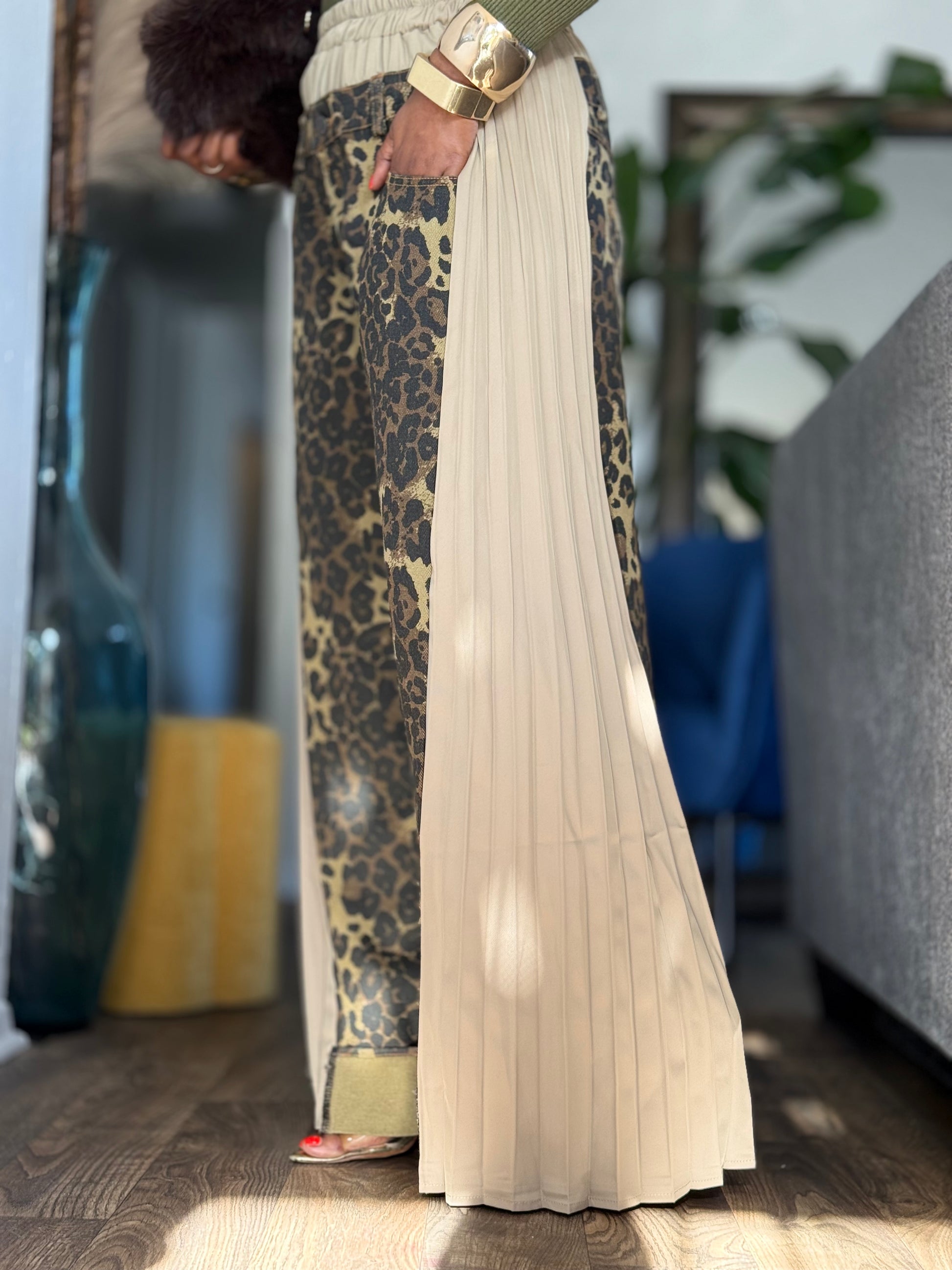 Add a distinctive vibe to your collection with these leopard accented pants featured in a pull-on, high waisted style with elasticized waist, pockets, beige contrasting pleated side panels and wide leg finish.
