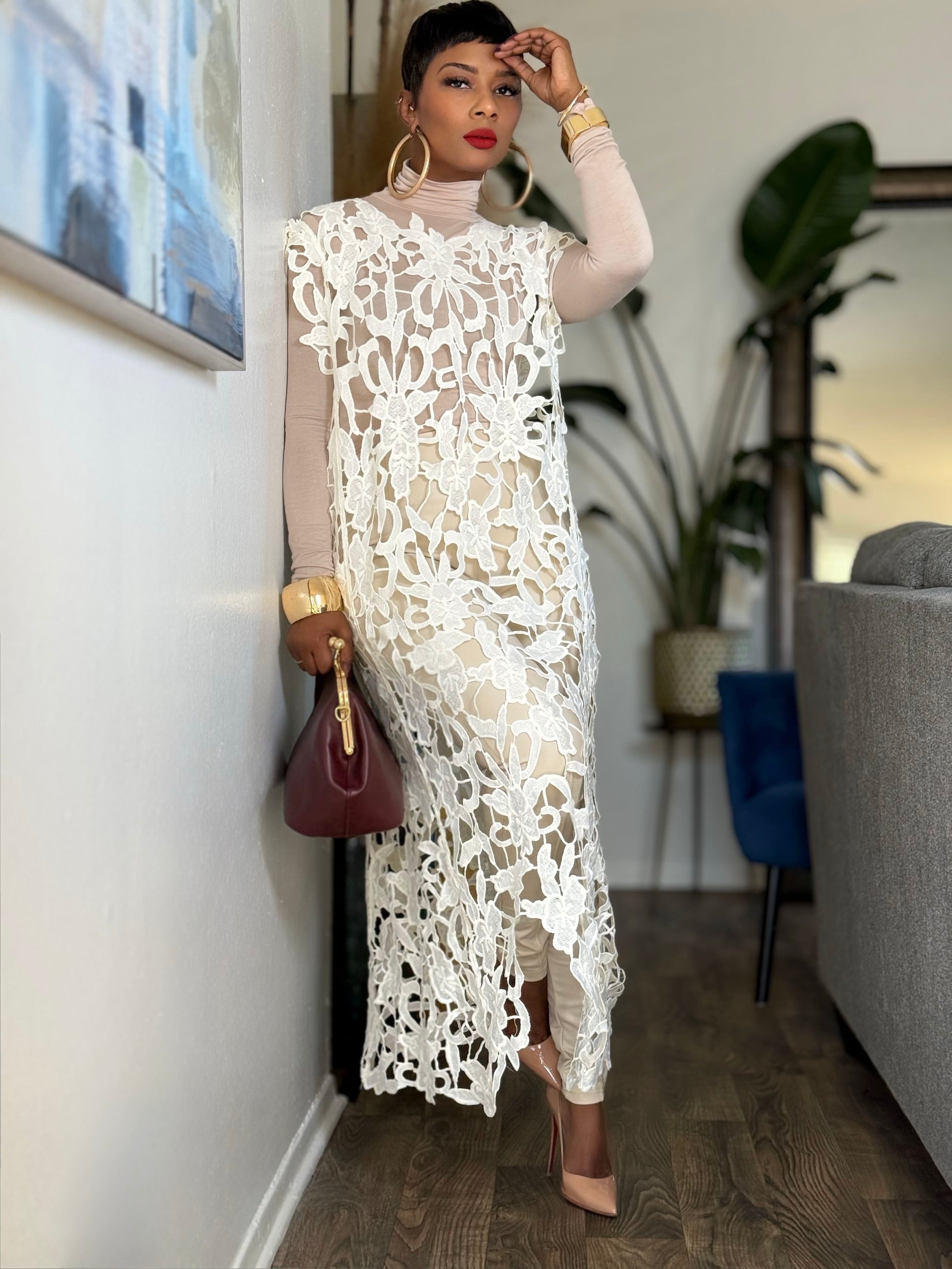 Showcase effortless, bold style in this eye-catching dress featured in an all over open-knit with bateau neckline and short sleeves.