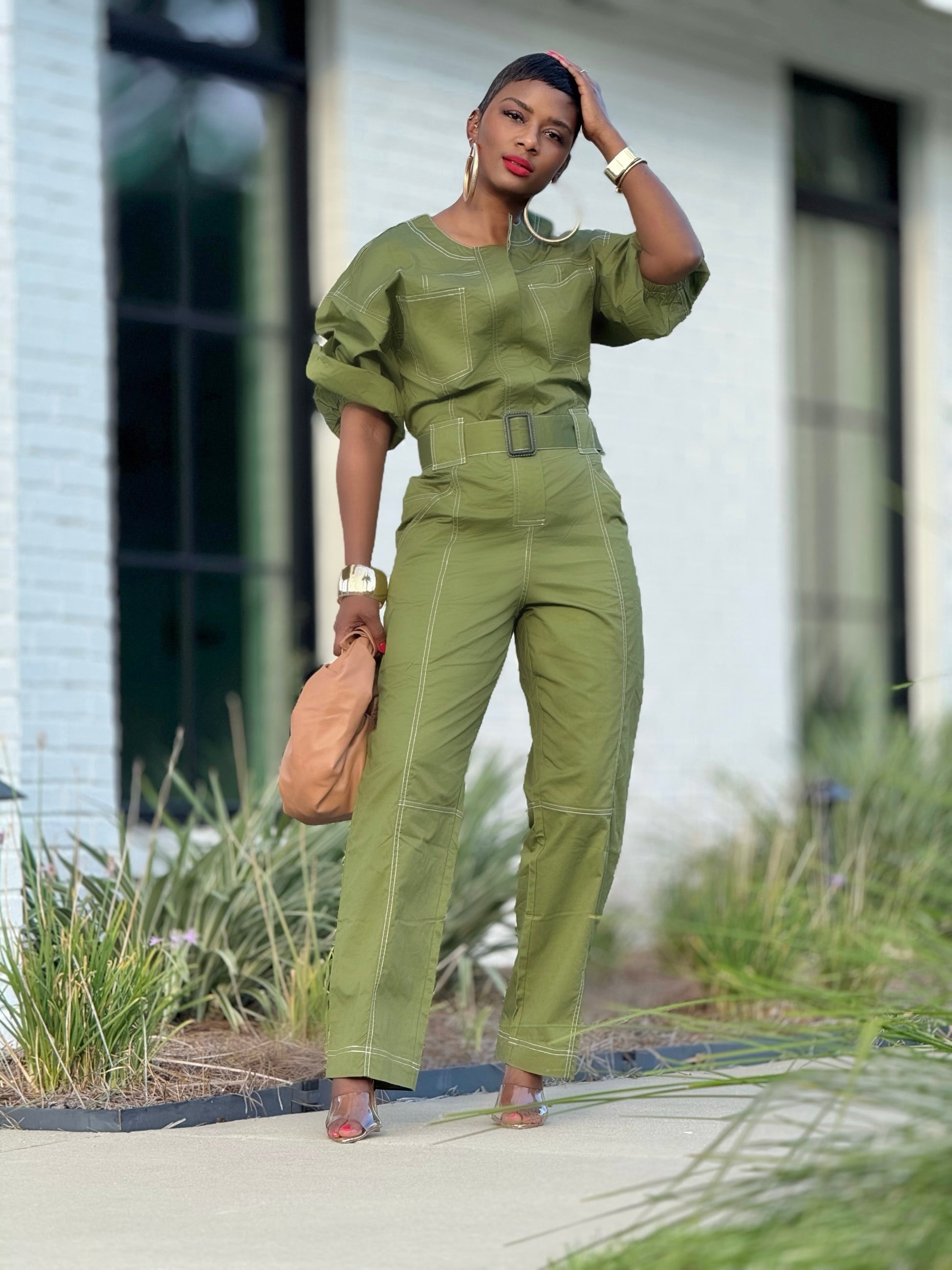 Fashion meets function in this utilitarian style jumpsuit which features a rounded neckline, 3/4 sleeves, zip front closure, matching belted waist, multiple pockets and visible white seam detailing