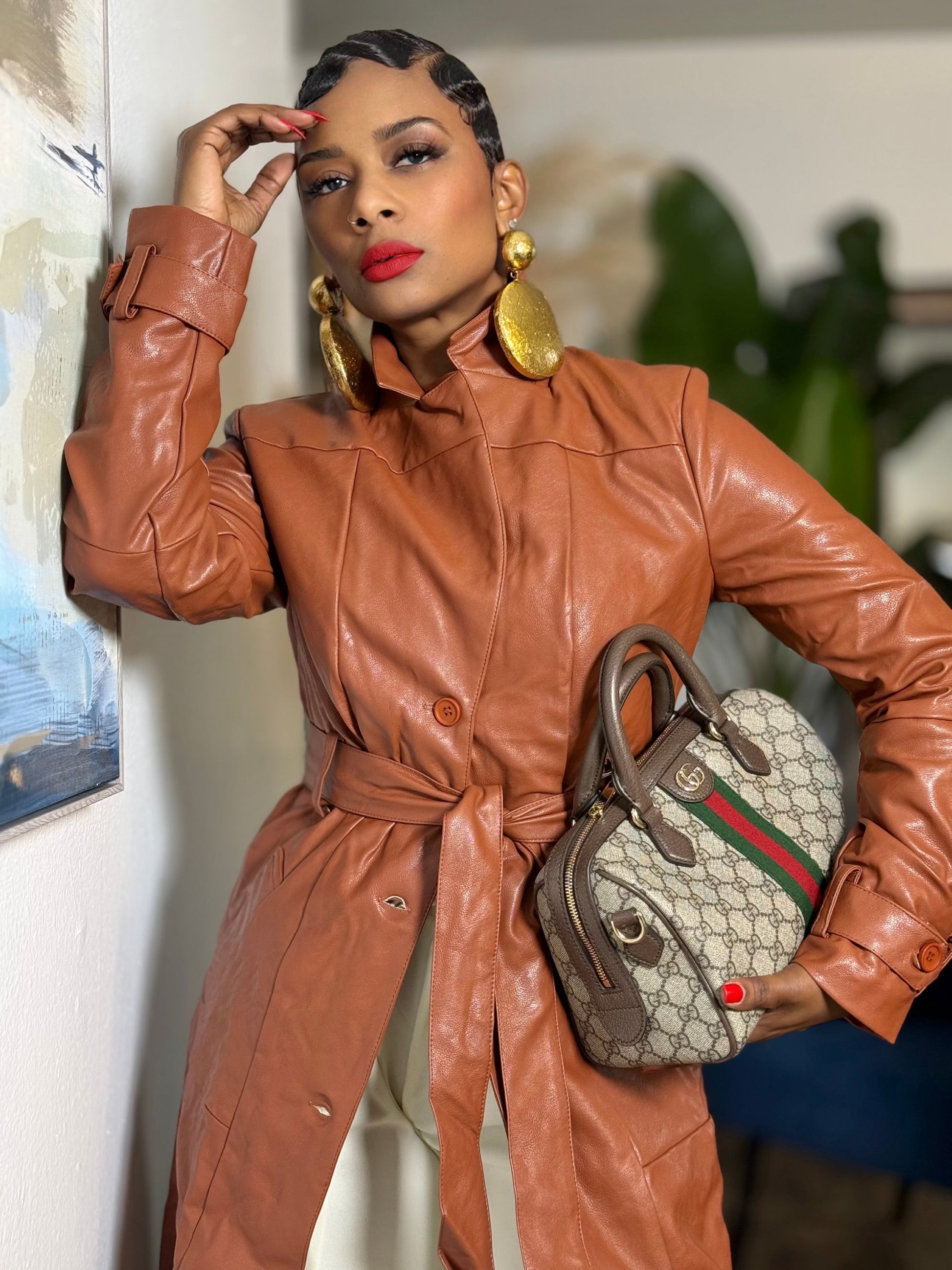 Strut the streets in striking style wearing this sleek faux leather dress coat featured in a midi length with collared neckline, long sleeves, functional pockets, button front closure and removable tie belt
