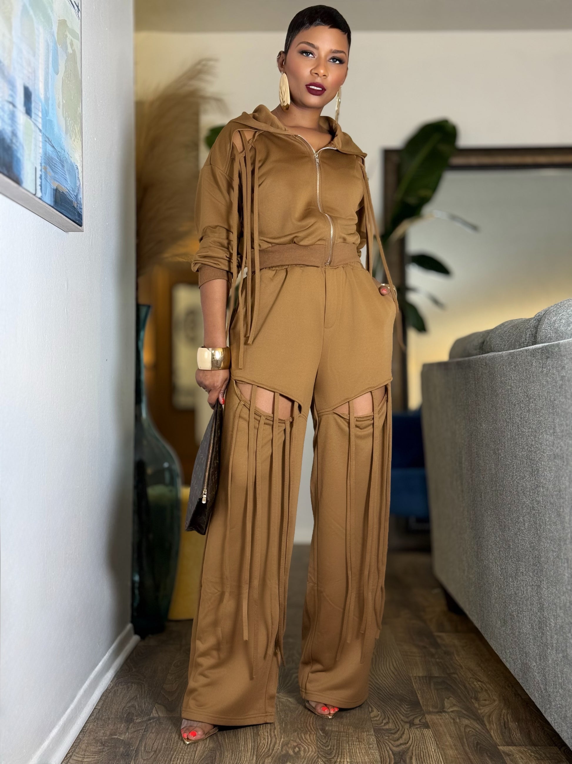 When fashion duty calls, answer with this edgy and oh so comfortable two piece set featuring a long-sleeved, hooded crop top with a zippered front and matching wide-leg pants with elasticized waist, pockets, hollowed-out details and long tassels.