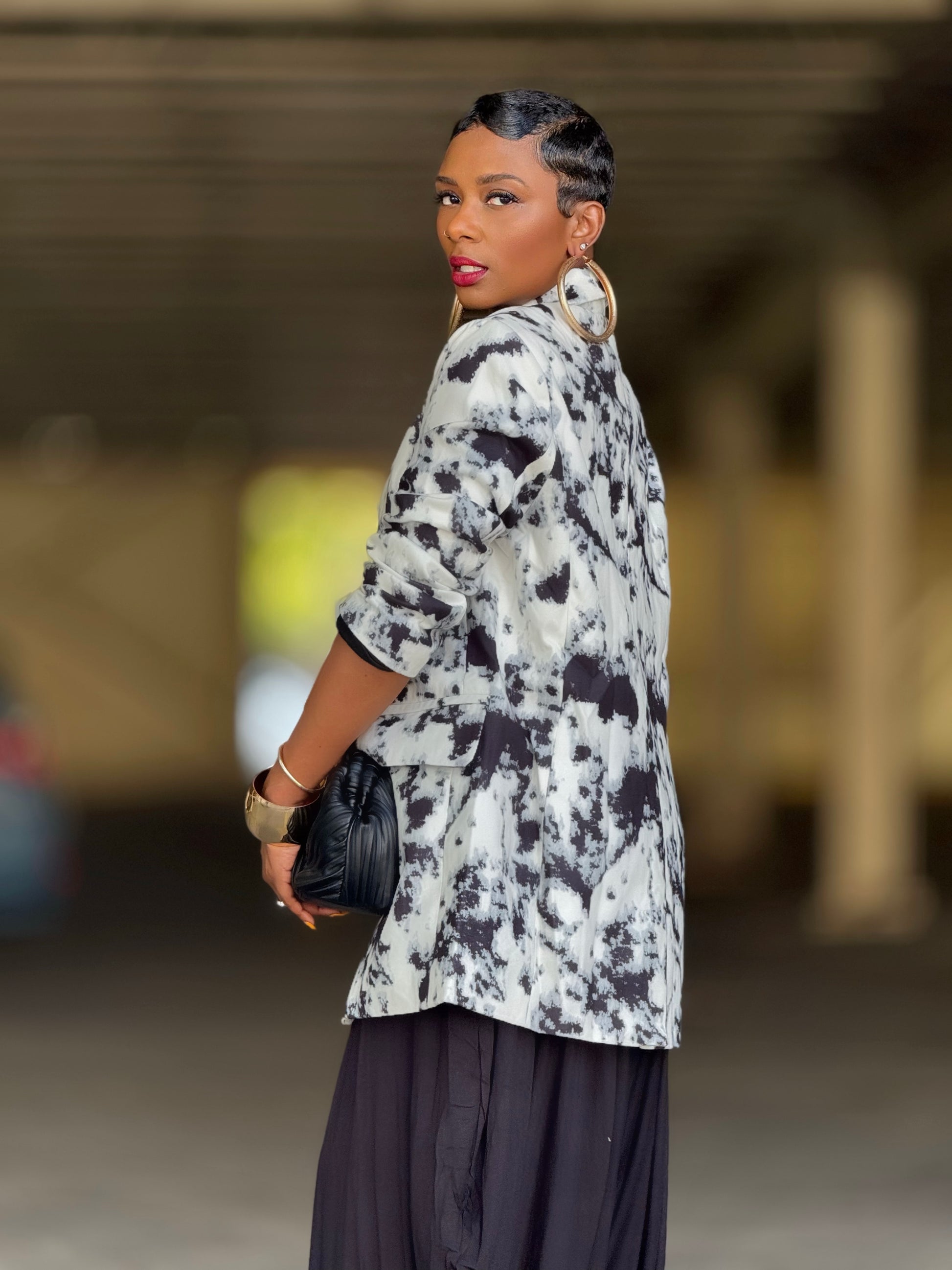 Showcase attention getting style in this statement making blazer featured in a relaxed style with all over tie-dye pattern, collared neckline, notched lapels, long sleeves, button closure, front pocket detailing and vented back.