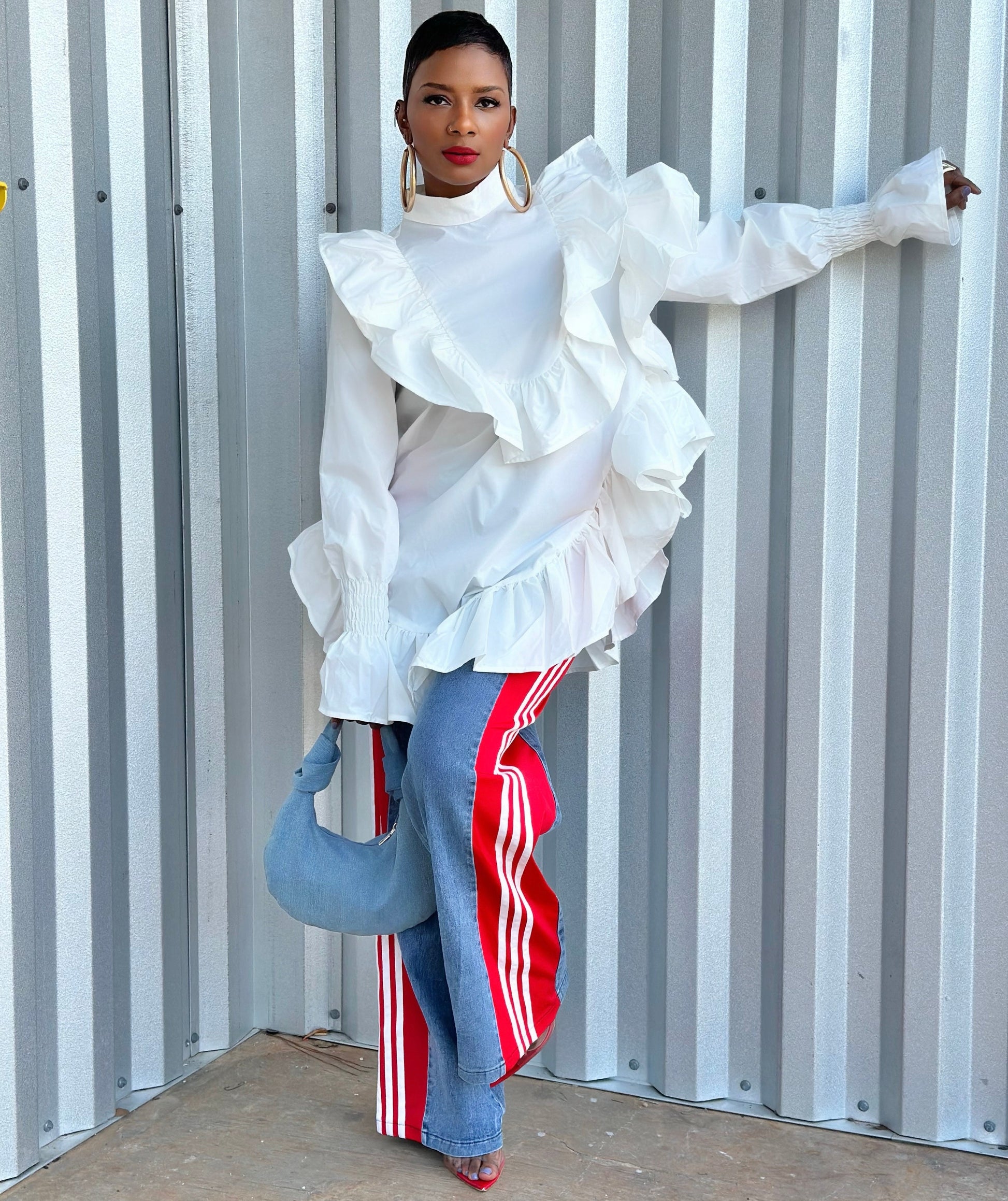 Embrace drama with this Victorian inspired blouse which features a high neckline, long sleeves, elasticized wrist detailing, dramatic asymmetric ruffles on the bodice and hem and back button closure.